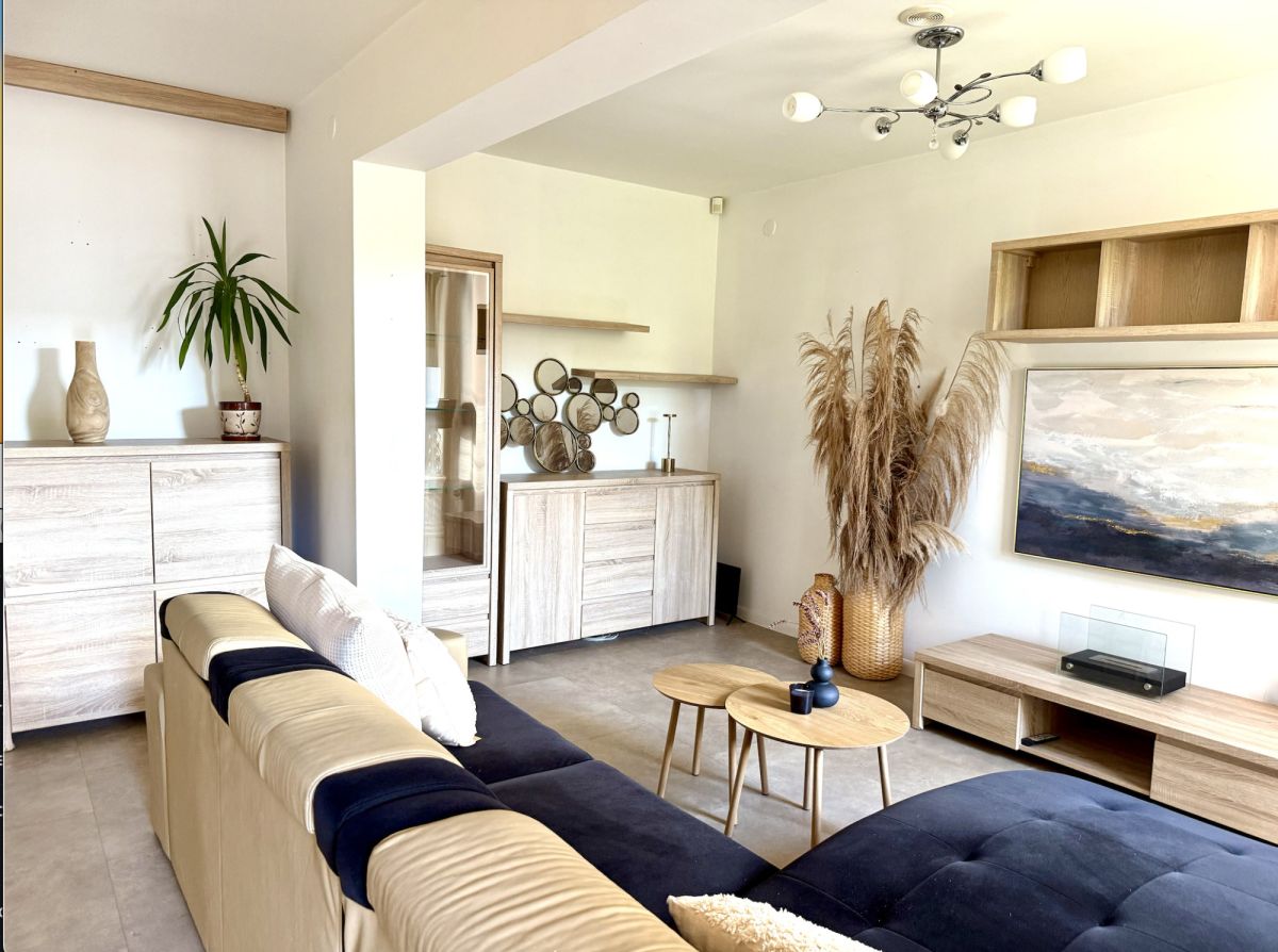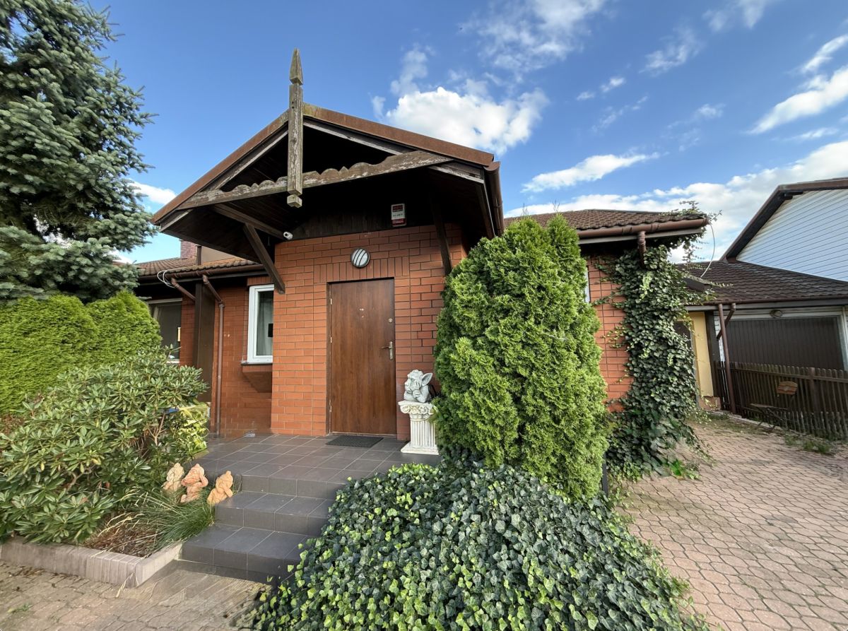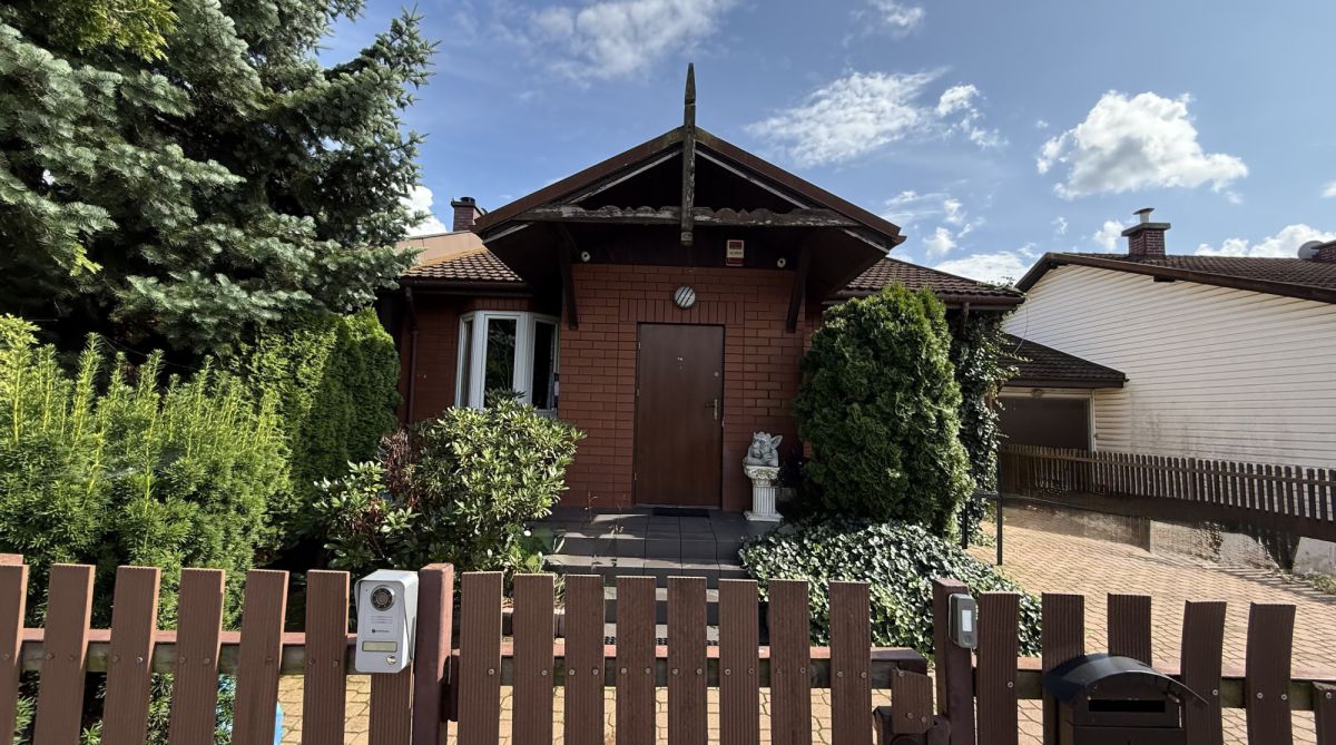 Dom częściowo umeblowany, z zadbanym ogrodem i drewnianym tarasem, idealnym na wypoczynek.